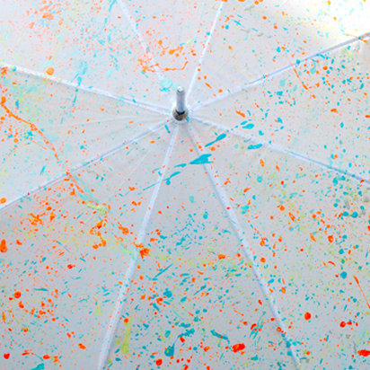 02 // PAINT YOUR UMBRELLA Open your umbrella and rest on it’s handle. Splatter each color one at a time, rotating the umbrella in the process. Allow each layer of paint to dry before applying the next. Once all colors are applied, set aside to dry overnight.