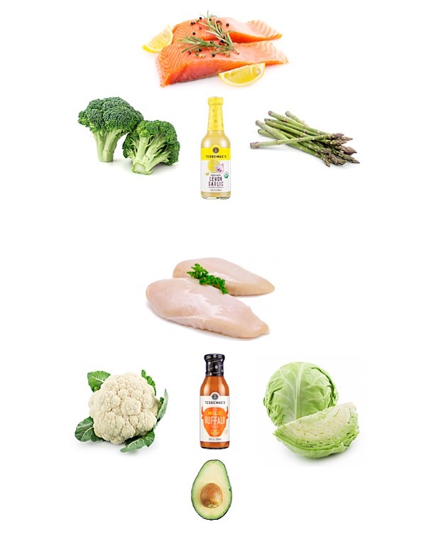 For prep, I simply throw the salmon (plus dill and mint, totally optional) in the middle of a large skillet on medium heat. Once I turn the salmon once, I add broccoli or asparagus around the salmon to lightly cook/sautee in the lemon garlic dressing. Dinner in ten, fifteen max! - Buffalo chicken + cauliflower + avocado, OR
